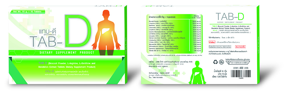 | ผลิตภัณฑ์อาหารเสริม TAB-D ประกอบด้วยสารอาหารที่เป็นกรดอมิโนและโปรตีนอันเป็นสารที่ตับผลิตได้ในตอนหนุ่มสาวหากแต่เมื่ออายุมากขึ้นหรือตับทำงานบกพร่องทำให้ตับไม่สามารถผลิตกรดอมิโนเหล่านี้ได้ตามปรกติอีกต่อไปอันเป็นสาเหตุให้เกิดภาวะเลือดข้นหนืดมีสารพิษปะปนอยู่ในกระแสเลือด อันได้แก่ L-ARGININE(100%) L-GUTAMINE(100%) L-CYSTEINE(100%) L-LYSINE MONOHYDROCHLORIDE L-ORNtTHtNE(100%) L-LEUCINE (100%) L-ISOLEUCINE (100%) L-VALINE (100%) |