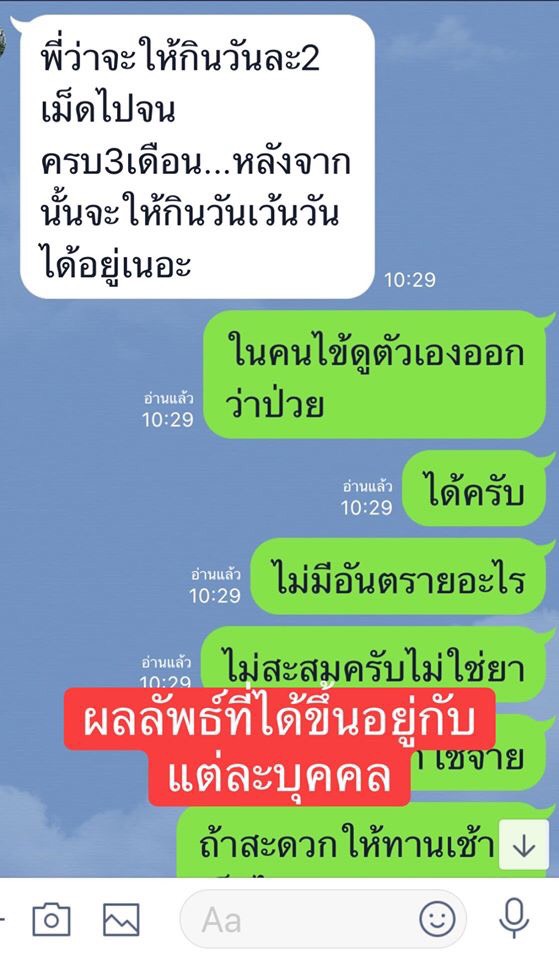 หนึ่งกล่องมี 10 เม็ด รับประทานเช้าเย็น ครั้งละ 1 เม็ด เดือนละ 6 กล่อง 1,500 บาท |