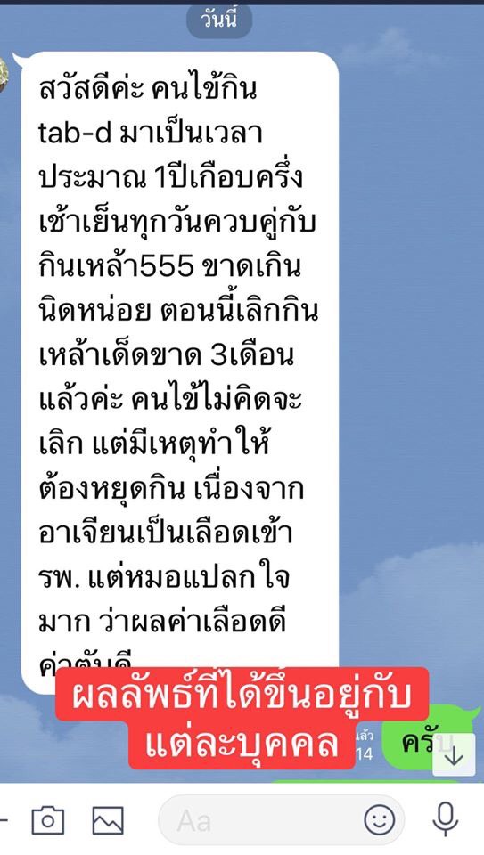 โรคไวรัสตับอักเสบ A ไวรัสตับอักเสบ B ไวรัสตับอักเสบ C ทั้งชนิดเฉียบพลับ เรื้อรัง หรือเป็นพาหะ ที่ตรวจพบเอ็นไซม์ตับขึ้นสูงๆตลอดมา อาหารเสริม TAB-D ช่วยท่านได้ แผงเดียวไปตรวจเลือดได้เลย เอ็นไซม์ตับลดลงเท่าคนปรกติทันทีรับรองผลเพราะทดสอบมาแล้วจากห้องปฏิบัติการ ลดอาการเสี่ยงจากการเกิดโรคมะเร็งตับในภายภาคหน้าจากไวรัสตับทุกชนิด TAB-D เท่านั้น 1 เม็ดเช้า-เย็นกลับมาเป็นตัวของตัวเองทันทีไม่เป็นคนหงุดหงิดโมโหร้ายจากโรคตับอักเสบ