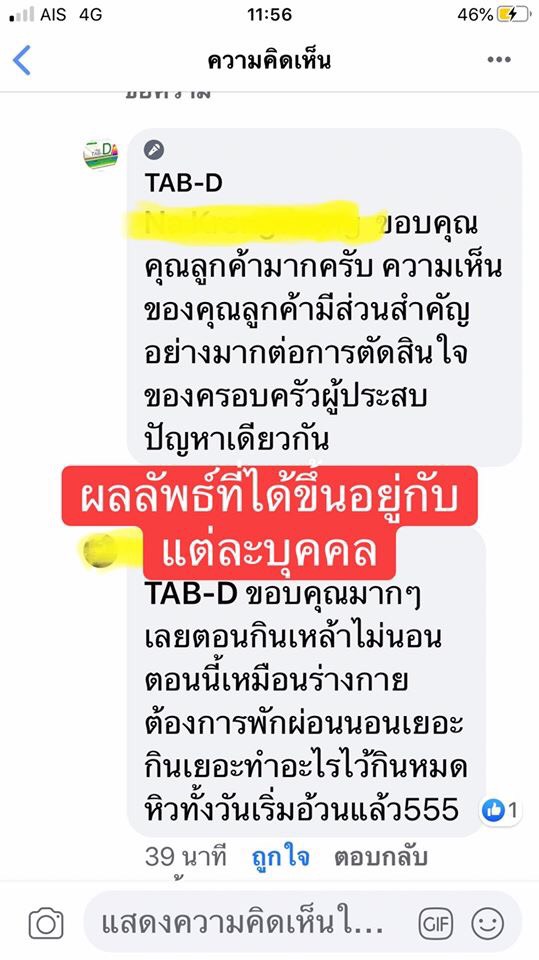 หากคนในครอบครัวเป็นโรคสมองเสื่อมจากสุรา มีอาการคล้ายคนชรา พูดช้า เดินช้า ทำงานไม่ได้ ไม่สนใจตนเอง หดหู่ สิ้นหวัง ไม่กระตือลือล้น กินอาหารได้น้อยมาก ผอมลงจนเห็นได้ชัด ไม่สุงสิงพูดคุยกับใคร อย่าพึ่งสิ้นหวัง เอาอาหารเสริม TAB-D ไปให้กินเพราะมีอาหารบำรุงตับตามธรรมชาติ บวกกับวิตามินซีเพิ่มภูมิคุ้มกันและวิตามินบีช่วยบำรุงและพื้นฟูสมอง คนของท่านจะศีรษะโล่งทันที กินข้าวได้ อารมณ์ดี น้ำหนักขึ้นทันทีในหนึ่งเดือน อาการโรคสมองเสื่อมจากสุราข้างต้นจะหายไปกลับกลายเป็นคนเดิม TAB-D ใช้ได้ผลกรุณาบอกต่อผู้ป่วยรายอื่นๆต่อไปด้วย